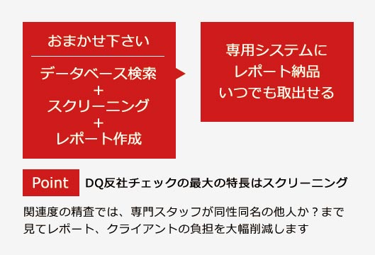 検索結果報告 | プロの調査員によるスクリーニング済レポート 専用Webシステムでダウンロードが可能(PDF、CSV) 調査結果は、「該当情報」「要再調査情報」「ネガティブ情報」の3段階で報告 |